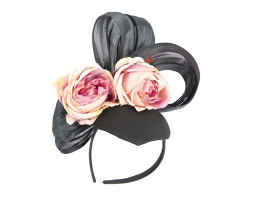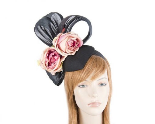 Heart-shaped black felt fascinator with posh silk abaca trim and two large pink roses. This bespoke fascinator is designed for Autumn and Winter race meetings.
